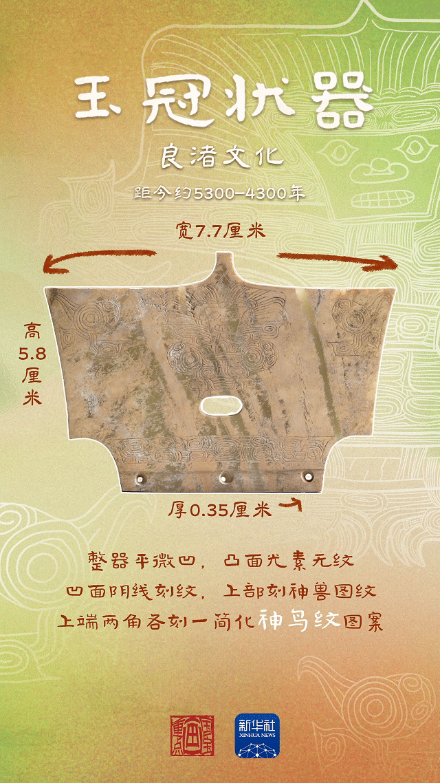 玉冠状器是一种有代表性的良渚玉器,它是戴在头上的玉插件,标识墓主人身份、等级和位置。它的根本形制取自“神面纹”中神人头上的“介”字形冠帽。
