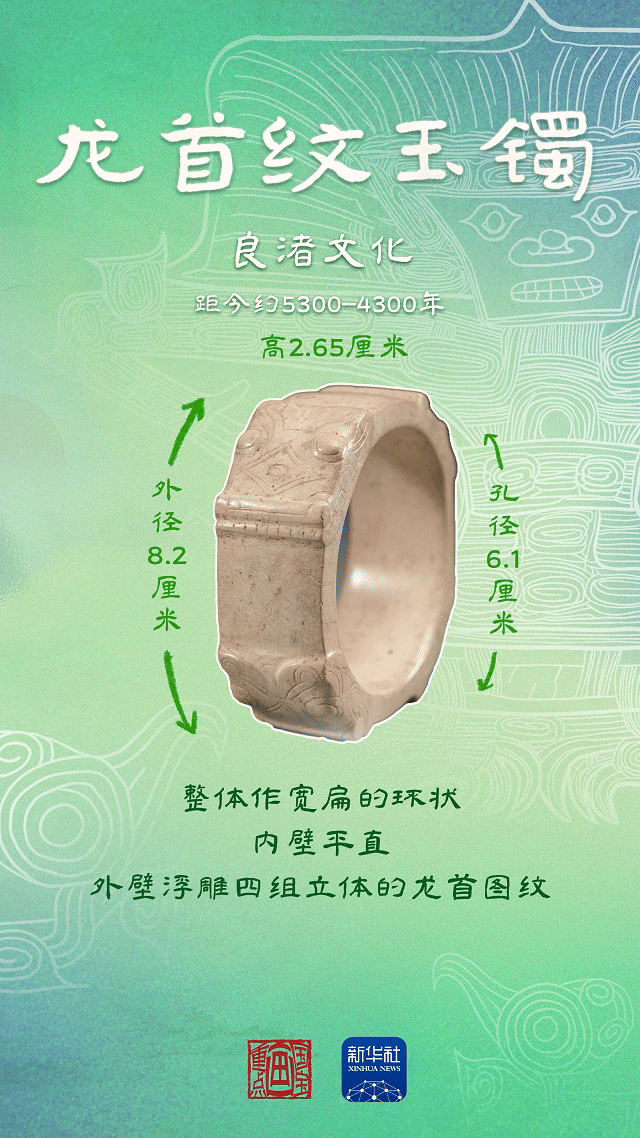 在良渚文明的前期,先民在雕刻玉器时,也曾刻绘过龙头的形象。这枚龙首纹玉镯出土于瑶山遗址中的一座女人墓地,表现了其时女人在部族中的较高位置。