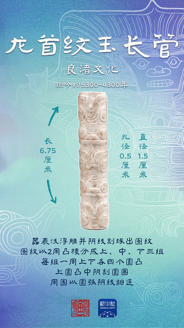 这件玉长管上相同雕刻了龙首纹。这种以环形玉器作为首要载体的表现方式,与红山文明的玉龙,商周青铜时代的龙形玉玦等极为类似,反映了文明的传承和交融。
